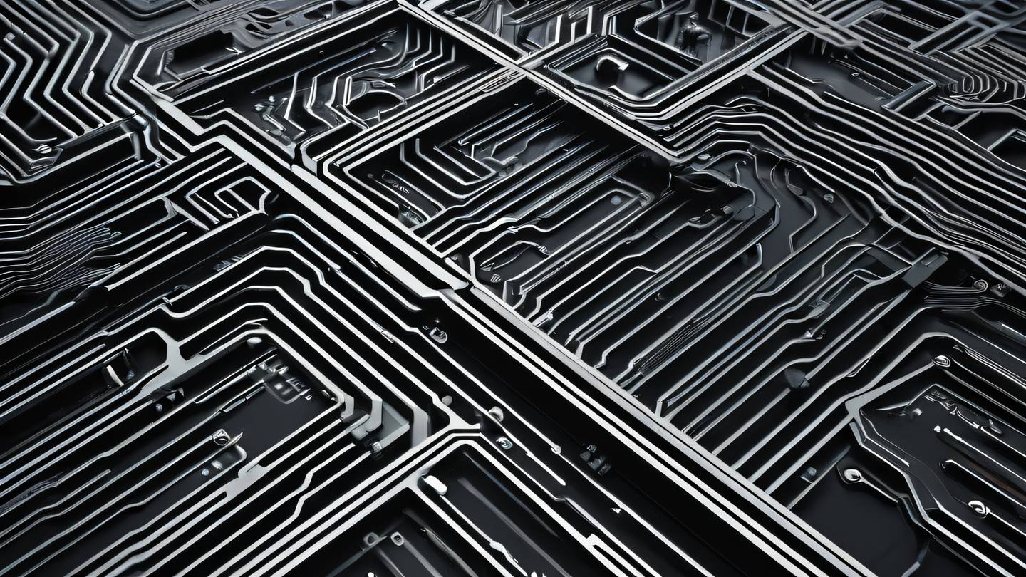 Aerial view of interconnected geometric patterns resembling circuit boards in bright black and white tones creating abstract technological landscape captured from top-down perspective high-quality ultra-realistic cinematic 8K UHD high resolution sharp and detail